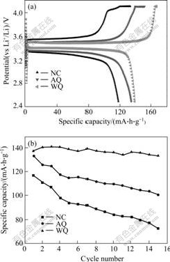 Fig.4(a) shows the first charge-discharge cyclic curves for LiFePO4 with three different falling temperature method. The charge-discharge current density is 0.1C rate (15 mA/g) with cut-off voltage of 2.5-4.1 V at room temperature. The sample prepared by water quenching (sample WQ) has the highest discharge specific capacity of 138.1 mA?h/g, while the samples NC and AQ display the reversible specific capacity of 117.3 and 133.8 mA?h/g, respectively, and the separate distance between charge plateau and discharge plateau of WQ is also the shortest, which means the lowest electrode polarization. The cycling stability of samples NC, AQ and WQ is shown in Fig.4(b). The discharge capacity losses of samples NC, AQ and WQ are 38.2%, 24.4% and only 3.11%, respectively after 15 times cycles. The sample WQ processes the highest discharge capacity and the most excellent cycling performance.