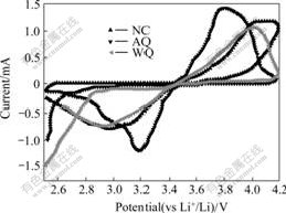 Fig.5 shows the cyclic voltammogram curves of samples NC, AQ and WQ in the first cycle at the scan rate of 0.5 mV/s between 2.5 and 4.2 V. All curves have a pair of peaks, consisting of an anodic and a cathodic peak, observed around 3.45 V (vs Li+/Li), corresponding to the two-phase charge-discharge reaction of the Fe2+/Fe3+ redox couple. The oxidation and reduction peak positions for samples NC, AQ and WQ occurred at 4.09 and 2.97, 4.01 and 2.92, 3.78 and 3.18 V(vs Li+/Li), respectively. The sample WQ has the narrowest peak separation, indicating excellent kinetic reversibility of the two-phase transformation.