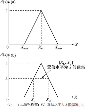 模糊集理论[10]是由Zadeh于1965年提出的,目前已广泛用于处理信息不完备问题,适于用来处理地质信息的不完备性。对于一个不确定参数可用三角模糊数来表示,如图1所示。图1中:Xmin表示参数的下限;Xm表示参数的最可能值;Xmax表示参数的上限值。则一个参数可用模糊数[Xmin,Xm,Xmax]来表示,从中取的每一个定值X都有相对应的置信水平A(X)。