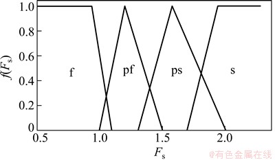 (1) 设fi(Fs)为第i种边坡状态的模糊函数(即图4中的4类曲线,i=1~4),A(Fs)为模糊数Fs的置信水平函数,按照式(1)计算出模糊数Fs隶属于哪种边坡状态下的映射分量Si: