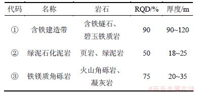 兰伯特角露天铁矿位于澳洲兰伯特角地区。现其中部下盘边坡有平面滑动破坏的可能,需要重新进行稳定性分析,以确定在该区域是否有必要重新设计边坡线,或采取加固措施。中部矿区平面图和钻孔分布如图5所示。从图5中截取4个地质剖面作为边坡稳定性分析的依据,其中M-M′截面的岩层分布情况如图6所示,各岩层的代码、名称、RQD及厚度见表1。