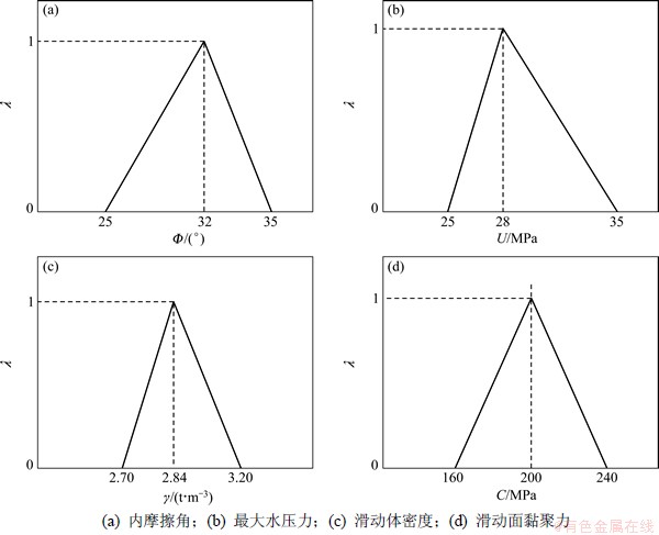 根据表2将岩石体质量、滑动面黏聚力和摩擦角、水压力作为模糊参数,并按照测量数据的分布情况确定最可能值,从而得出模糊参数的三角模糊数,采用测量数据的几何平均值作为三角模糊数中的最可能值,如图8所示。