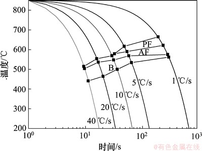 图3所示为实验钢的动态CCT曲线。从图3可以看出:在不同冷速下,组织中均有针状铁素体(AF)和贝氏体(B)组织;当冷速小于10 ℃/s时,组织中会出现多边形铁素体(PF);随着冷速的增大,组织中贝氏体含量逐渐增大。