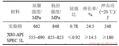 实验用X80管线钢采用低质量分数的C,N,P和S的成分设计。具体成分为:w(C)=0.02%~0.04%,w(Si)=0.2%~0.3%,w(Mn)=1.8%~1.9%,w(S)≤0.003%,w(P)≤0.015%,w(Nb+V+Ti)≤0.13%,w(N)≤40×10-6;Mo,Cu和Ni的质量分数适量。
