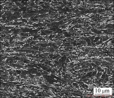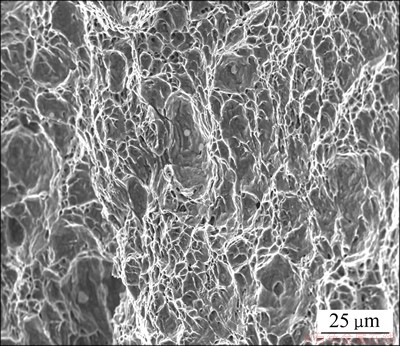 图5所示为实验钢的扫描电镜像,图6所示为实验钢的透射电镜像,图7所示为冲击断口的微观组织像。从图5可以看出:实验钢的组织为针状铁素体(含有一定量准多边形铁素体)、少量贝氏体和M/A岛组织。组织中软相是准多边形铁素体和针状铁素体,硬相是贝氏体和M/A岛,软硬相差异较大,因此,屈强比较低,仅为0.78。实验钢具有较高的强度可以解释为:当超快冷终止温度为655 ℃时,组织中观察到微孪晶结构(如图6(a)所示),孪晶马氏体组成的M/A提高了实验钢的强度;同时超快冷的极快冷速抑制了微合金元素在奥氏体中的析出,促进了析出物的低温析出(如图6(b)所示),析出物细小弥散,析出强化作用显著,此时实验钢通过细晶强化、相变强化、析出强化提高了强度。