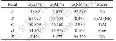Fig.2 is the micrographs of TAN1. Fig.2(a) shows that TAN1 is mainly composed of two parts: particle substances and matrix. The particle substances dispersed in the matrix appear in two morphologies: islands and flakes. Fig.2(b) shows the BSE microstructure of TAN1. The compositions of the different phases in Fig.2(b) measured by EDS are listed in Table 1. EDS results indicate that the white regions (such as point A and E) are residual Nb powders, gray region (point B) locating at the edge of the white regions is Ti3Al phase dissolved Nb element, black region (point C) is TiAl phase, and the small black regions (point D) dispersed around the larger white region are pore nests formed in situ after Nb powders diffusion. The diffusion of elemental Nb is incomplete in TAN1, and pore nests form in situ after Nb powders diffusion. It can be concluded that, therefore,