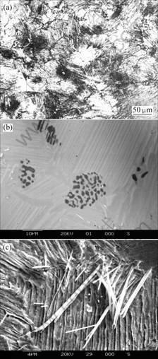Fig.4 shows the microstructure of TAN3. A fully lamellar (FL) microstructure was developed out (Fig.4(a)). The lamellar colonies with a size of approximately 30-80 μm in TAN3 consist of very straight and smooth α2/γ laths. This FL microstructure is similar to that of as-cast alloy, but it is finer [11]. BSE microstructure of TAN3 is shown in Fig.4(b). It indicates that elemental Nb powders diffuse completely, and pore nests are formed in situ. The deformation and agglomeration phenomena of pores are observed in some pore nests. Furthermore, particulate and acicular borides firstly appear in the FL microstructure (Fig.4(c)).