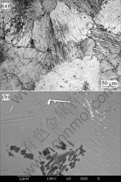 The hot pressed samples were subsequently cut, polished and etched using Kroll’s solution (2HF+2HNO3+H2O (volume fraction, %)). Micro- structural observation was carried out by optical microscopy (OM), scanning electron microscopy using back scattering electron imaging (BSE) and energy dispersive spectroscopy (EDS). X-ray diffraction (XRD) was conducted to characterize the constituent phases. The lamellar colony size was determined by the intersection linear method.