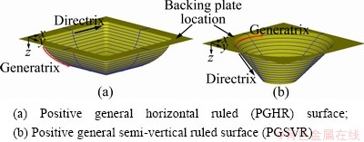 Ruled surfaces can be defined by a curve called the generatrix, which moves along a line called the directrix to create the ruled surface or a surface through every point of which there is a straight line called the directrix. Hence, the orientation of the directrix can be used to classify ruled surfaces as horizontal when the directrix is in the plane of the backing plate or parallel to it, and semi-vertical when it is at an angle, as shown in Fig. 3. This classification also helps account for the differential behaviour in accuracy observed in the forming of these surfaces. Figure 4 illustrates that for a positive general horizontal ruled surface made of alumimum alloy Al-3103 of 1.5 mm in thickness, the manufactured part is underfomed until 48 mm and for the last 10 mm, it is overformed. However, the semi-vertical ruled surface is consistently underformed with no regions of overforming.