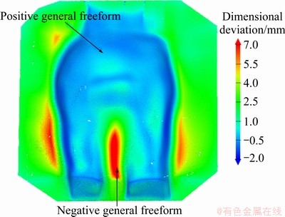 Freeform features are characterized by both principal Gaussian curvatures larger than 0, but below a threshold. Freeform features located at the bottom of the part require special processing tool paths such as bottom finishing, due to their tendency to overform or form into a pinched nipple structure as shown in Fig. 6. It is particularly interesting to observe the difference in accuracy behaviour of PGHR surface and a double curved surface as seen in Fig. 6. Although both surfaces have a similar section in YZ plane, their accuracy characteristics are remarkably different. While the double curved surface is consistently underformed the PGHR surface has zones of both underforming and overforming. The rest of the classification for freeform features is based on their curvatures, which decides the magnitude and nature of inaccuracy, as shown in the back seat orthosis part of Fig. 7. Figure 8 shows the detailed classification for freeform features.