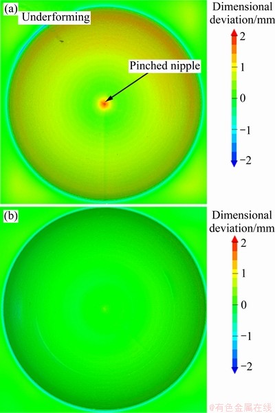 Fig. 13 Accuracy plots of double-curved hemi-sphere made using uncompensated tool path (a) and compensated tool path (b)