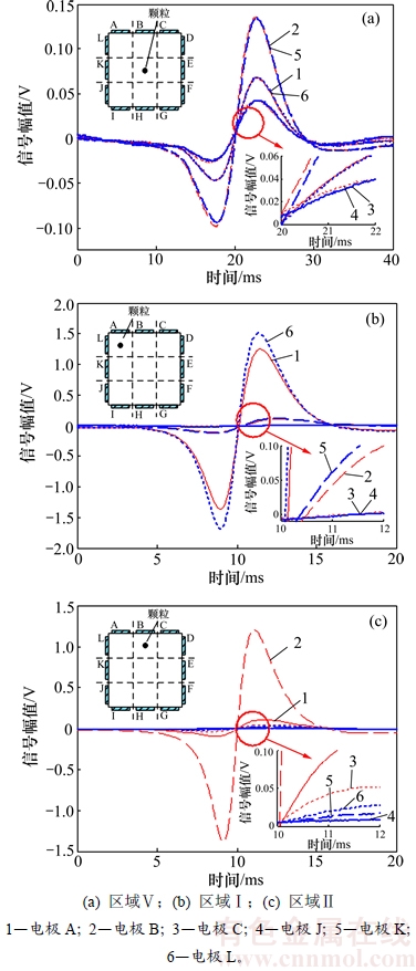 由图8(a)可知:当颗粒经管道中心区域Ⅴ中心轴线流经传感器阵列时,各电极与颗粒距离均比较远,传感器整体输出较弱,其中电极B和K距离颗粒相对最近,输出最强,二者输出信号的峰峰值约0.23 V。由图8(b)可知:颗粒经管道直角区域Ⅰ中心轴线流经传感器阵列时,电极A和L距离颗粒最近,输出最强,其中电极L输出信号的峰峰值约3.2 V;其次为电极B和K,电极C和J因距离颗粒远,感应输出弱。由图8(c)可知:颗粒经单面管壁区域Ⅱ中心轴线流经传感器阵列时,电极B距离颗粒最近,输出最强,峰峰值约2.6 V;其次是电极A和C,电极L,K和J因距离颗粒较远,输出弱,但从局部放大图中依然可以看到,随着与颗粒的距离依次增加,电极L,K和J输出相应递减。由图8可知:传感器阵列敏感空间在管道轴向方向上的尺寸远大于条形电极的宽度,靠近颗粒处的电极输出强度大,传感器阵列可以区分颗粒的位置信息。