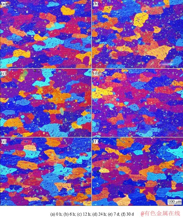 图2所示为6061铝合金停放0 h、6 h、12 h、24 h、7 d、30 d再经过人工时效的金相图。通过对比其中的微观组织可以看出:停放0 h时,6061铝合金晶粒尺寸均匀性较好,晶粒形状为不规则的多边形;停放6~12 h时,部分晶粒的尺寸显著增大,晶粒尺寸的均匀性降低;停放时间大于24 h时,晶粒尺寸的又有所减小,晶粒尺寸的一致性提高,并逐渐趋于稳定。