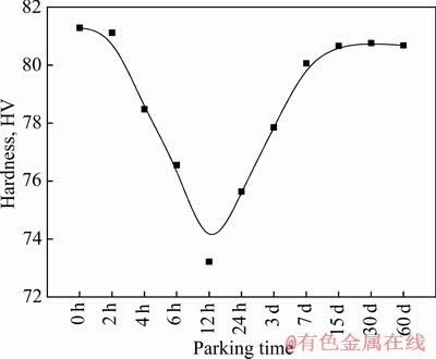 图4所示为停放时间与6061铝合金硬度的关系曲线。由图4可知,停放时间为0~2 h时,合金的硬度变化不大;但当停放时间为2~12 h时,合金的硬度快速下降,并在停放12 h时,达到最小值73.2HV,较停放0h时下降了10%;停放12 h~7 d时,合金的硬度开始快速增长,并在停放15 d后,达到稳定状态,约为81HV,较初始值降低了0.7%左右。