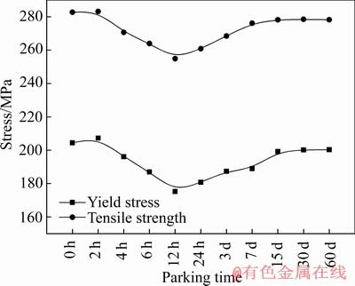 图5 停放时间与6061铝合金的屈服强度、抗拉强度的关系