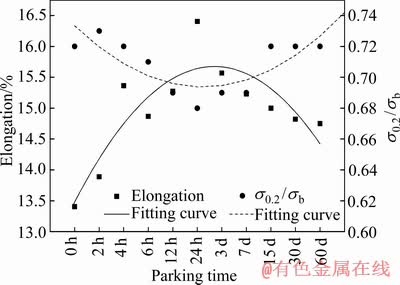 图6 停放时间与6061铝合金的伸长率、屈强比的关系
