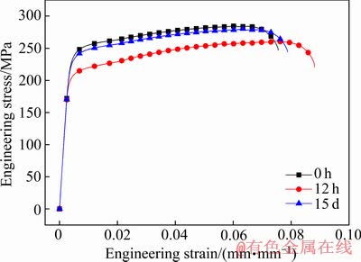 图7所示为典型停放时间0 h、12 h、15 d条件下材料的工程应力-应变曲线。由图7可见,6061铝合金在不同停放时间下的应力-应变曲线的弹性段几乎完全一致;通过计算测量,得出其斜率约为68 GPa,说明停放对材料的弹性模量没有影响。