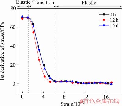 为准确获得弹塑性变形的临界点,对应力-应变曲线进行微分,并结合Langevin Mod非线性拟合,获得应力的变化率曲线,如图8所示。由图8可知,曲线由3个典型阶段组成,在变形初期,应力-应变曲线保持稳定的斜率,其斜率值即为6061铝合金的弹性模量,三组试样曲线基本重合,说明停放时间对弹性变形线性阶段的影响较小。当应变超过材料的比例极限σp后斜率开始下降,其中停放时间为12 h试样应力1阶倒数曲线最先开始发生下降,且下降速度明显高于停放0 h与15 d试样。当应变超过0.006时,材料完全进入塑性变形,三组试样的曲线再次重合,应力1阶倒数曲线的下降速度减慢并最终达到稳定。说明停放时间对塑性变形阶段的影响较小。