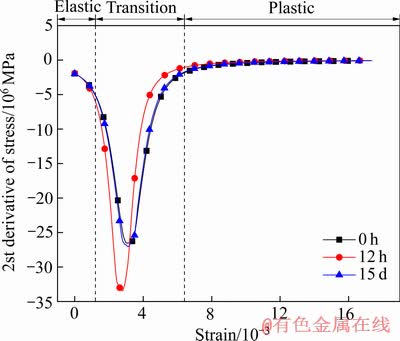 对图8再次微分能够获得试样应力斜率的变化率曲线,其结果如图9所示。曲线的最低点为应力-应变曲线的突变点,即为发生塑性变形的临界应变εcr。由图9可知,停放0 h与15 d试样应力二阶倒数曲线基本重合,临界应变约为0.0032;而停放12 h试样的临界应变出现较早,约为0.0026,且曲线的谷值更低。说明停放时间会对6061铝合金的弹塑性变形过渡阶段产生显著影响。