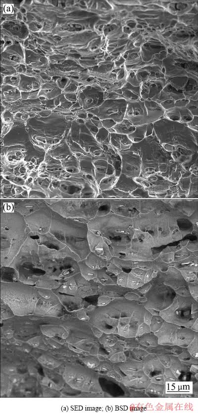 图15(a)所示为停放30 d时拉伸实验断口的SED像,可明显看出,此时韧窝形貌与停放15 d时的已经区别不大,此时韧窝直径进一步减小,且椭圆形韧窝数量减少,韧窝形状多为圆形,韧窝深度变浅;部分断口较为平整并呈现台阶状,这是脆性断裂的特征。图15(b)所示为停放30 d时合金的BSD像,与停放 15 d相比,部分第二相粒子尺寸变大,但分布规律基本相同,粒子形状多为多边形块状,散布在韧窝中。