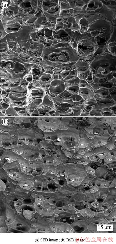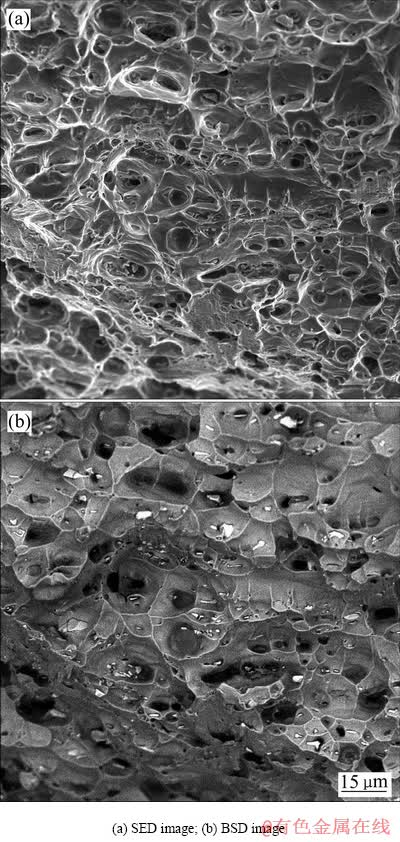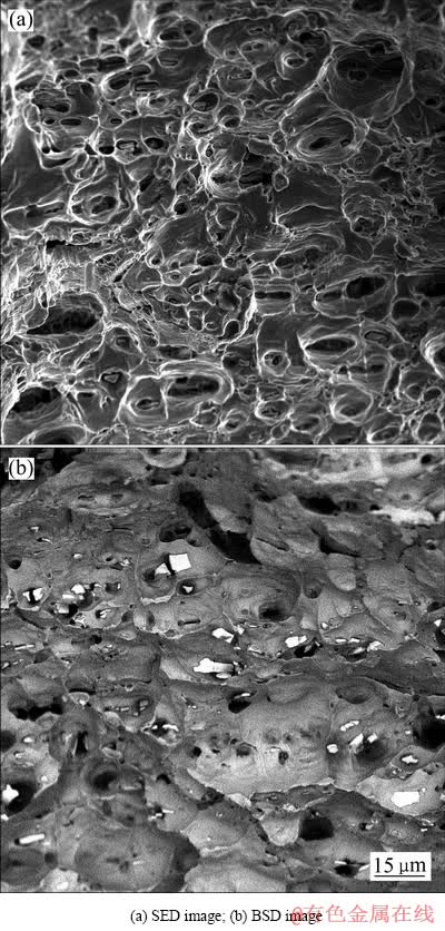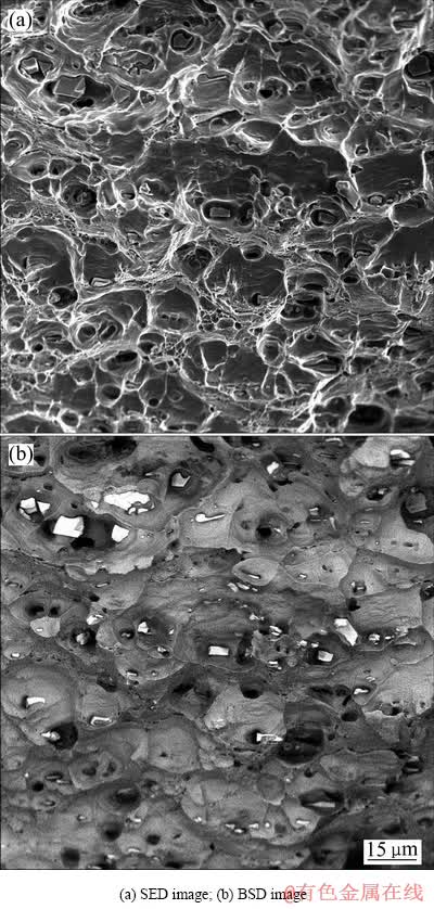 图12(a)所示为停放12 h时拉伸实验断口的SED像。由图12(a)可以看出,与停放2 h相比,断口的显微形貌出现了明显变化:断口表面台阶状花纹彻底消失,并出现了更多的韧窝,韧窝分布较密集,这些韧窝直径变化不大但形状更圆,大韧窝中包含小韧窝的情况减少,但韧窝边界的微孔仍然大量存在。除此之外,还可以看到部分韧窝的深度明显增加,难以直接观察到韧窝中的第二相粒子。图12(b)所示为停放12 h时合金的BSD像。在此停放时间下,第二相出现明显变化,原先较为均匀且分散的第二相粒子变得更加集中,一个较小的韧窝中可能聚集了多个第二相粒子。第二相粒子多分布在韧窝之中,几乎每个韧窝中都能观察到第二相粒子。此停放时间下的第二相中长条状粒子的厚度有所增加,且数量明显减少,取而代之的是多边形状的粒子。