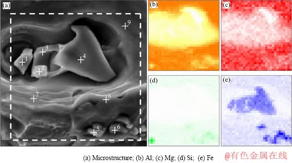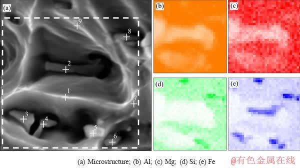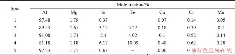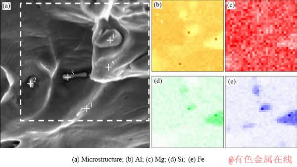 图16所示为停放2h时合金的微观组织和元素分布,表2所列为各点元素的摩尔分数。结合图16 表2可以看出,除Al基体外,Mg元素分布也较为广泛,Fe与Si元素分布情况较为相似,因此,可以判断图中第二相中包含富铁相。通过计算可以看出,点1和点5位置的主要成分是Al基体,含有少量的Mg化合物且不含Fe;点2、3、4的Fe与Si摩尔比分别为1.67、1.67、1.64,因此,可推断该点为α-AlFeSi。