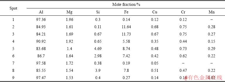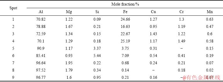 图17所示为停放12 h时合金的微观组织和元素分布,表3所列为各点元素的摩尔分数。结合图17和表3可以看出,点5、点6与点8的Fe与Si摩尔比为1.86、2.49及2.00,推测为α-AlFeSi相;同时,点2、点3与点4出现了一种Fe浓度很高的第二相,其中Si不足以与如此高浓度的Fe形成化合物,该第二相呈现出多边形或板状形貌。