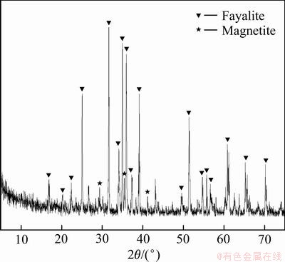 实验所用的铜渣取自大冶有色金属集团,为转炉渣经缓冷-浮选工艺回收铜矿物后的尾矿,其化学分析结果及XRD谱分别见表1和图1。由表1可知,铜渣中TFe和SiO2含量(质量分数)分别为43.91%和33.61%,而锌和铅的含量也分别高达2.98%和1.72%。图1的物相分析结果表明,铜渣中的主要物相组成为铁橄榄石和磁铁矿,其他物相因含量低或结晶形态差而未被检测。