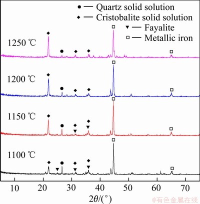 铜渣在1100~1250 ℃还原焙烧60 min产物的XRD谱如图4所示。还原焙烧产物中的主要物相为铁橄榄石、金属铁、石英和方石英。后续碱浸实验结果表明,还原焙烧产物中的石英和方石英均与110 ℃的氢氧化钠溶液剧烈反应,说明此石英和方石英有别于天然的石英和方石英,因此被定义为石英固溶体和方石英固溶体[20-21]。与图1相比可知,1100 ℃还原焙烧产物的XRD谱中磁铁矿衍射峰消失且铁橄榄石衍射峰明显减弱,新物相主要有石英固溶体、方石英固溶体和金属铁。因此,铁橄榄石的碳热还原产物为金属铁和SiO2固溶体(石英固溶体和方石英固溶体)。随着焙烧温度的升高,还原焙烧产物XRD谱中的方石英固溶体和金属铁的衍射峰增强,而石英固溶体和铁橄榄石的衍射峰减弱。因此,焙烧温度的升高对铁橄榄石的还原起促进作用,且促使石英固溶体进一步转变为方石英固溶体。当焙烧温度超过1200 ℃后,还原焙烧产物中铁橄榄石相消失,意味着铜渣中的含铁物相已接近完全还原分解。此结果与图3的分析结果一致。