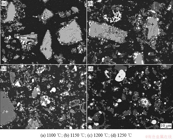 对铜渣在1100~1250 ℃还原焙烧60 min产物进行SEM-EDS分析,结果见图5和表4。在图5(a)中可明显发现铁橄榄石颗粒表面的反应层,其分解产物为金属铁和SiO2。由于反应温度低,还原焙烧产物中金属铁和SiO2颗粒均小于10 μm。未反应的铁橄榄石中仍能检测到锌元素的存在,此结果与表1中的分析结果一致。当焙烧温度升高至1150 ℃时,铁橄榄石颗粒表面的反应层增厚,且部分铁橄榄石颗粒出现细化的现象。相比于图5(a),图5(b)中金属铁颗粒尺寸明显增大。在1200 ℃和1250 ℃还原焙烧产物中可明显发现独立金属铁和SiO2颗粒的存在,其粒度大小不一。少量金属铁颗粒尺寸可超过10 μm,但是大部分金属铁颗粒尺寸均小于10 μm。此外,金属铁颗粒和SiO2颗粒主要连生在一起,且部分金属铁颗粒被SiO2颗粒所包裹。因此,通过磨矿-磁选工艺难以实现还原焙烧产物中金属铁颗粒的有效分离富集。