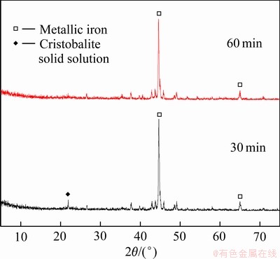 图7所示为浸出渣的XRD谱。与图4相比可知,石英固溶体衍射峰在30 min浸出渣的XRD谱线中消失,且方石英固溶体衍射峰明显减弱,进一步说明还原焙烧产物中的石英固溶体和方石英固溶体易溶于NaOH溶液;延长浸出时间至60 min时,方石英固溶体的衍射峰也随之消失。此结果与图6中碱浸溶硅结果一致。金属铁的衍射峰在碱浸前后并无明显变化,意味着金属铁在此浸出条件下不与NaOH溶液反应。因此,通过碱浸可实现还原焙烧产物中金属铁和SiO2的有效分离。