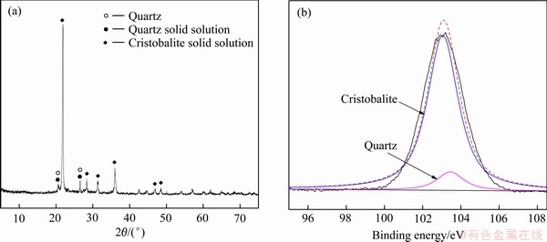 磁选尾矿的XRD谱及Si 2p的XPS谱见图8。图8(a)表明,磁选尾矿中的主要物相为方石英固溶体和石英固溶体。由图2中可见,铜渣中有少量的天然石英存在,经碳热还原-磁选后,天然石英也会进入尾矿,其衍射峰和石英固溶体的衍射峰一致。Si 2p的XPS谱(见图8(b))进一步表明,磁选尾矿中的SiO2主要以方石英和石英的形式存在,且不存在无定型SiO2,说明硅元素在石英固溶体和方石英固溶体中与其在天然石英和方石英中的化学结合状态一致。
