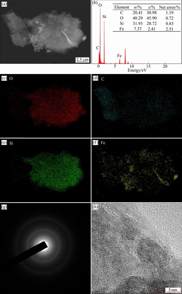 磁选尾矿的TEM分析结果见图9。如图9(b)所示,能谱分析结果表明,所选区域的主要化学组成为碳、氧、硅和铁,其质量分数分别为20.41%、40.29%、31.93%和7.37%。进一步结合图9(c)~(f)的元素面扫描结果可知,碳主要以独立形式存在,可归因于碳热还原过程中过量碳经磁选而富集于尾矿中。氧和硅元素分布一致,说明此区域为SiO2。需要指出的是,除部分铁集中分布在白色区域外,其它铁则以弥散形式均匀分布在SiO2中,说明在碳热还原过程中部分铁均匀掺杂在SiO2晶格中。对SiO2区域进行衍射花样分析(见图9(g)),所形成的衍射图样表现为一组圆环,说明此SiO2为无定型态,此结论也可由HRTEM中的原子的不规则分布进一步被证实(见图9(h))。