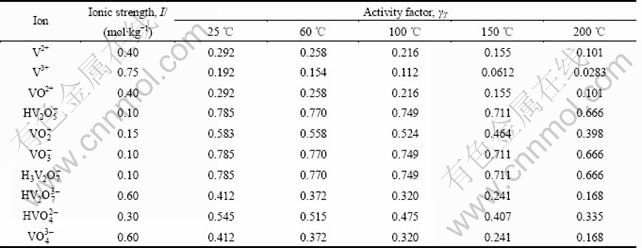根据文献[11-12,18-19]中的热力学数据,采用式(4)和(5)的计算方法,分别得到了温度为25、60、100、150和200 ℃,氧分压为0.5 MPa,V-H2O系中各反应的φ0值及pH0值,结果如表3和4所列。根据式(7)和(9)的活度因子计算方法,代入表2中的AT值,得到不同温度下V-H2O系各物质的活度因子,如表5所列。 取V-H2O系中各离子的质量浓度为0.1 mol/kg,得到各物质在不同温度下的活度。