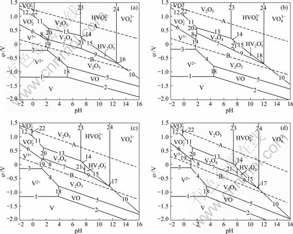 Fig.1 φ—pH diagrams of V-H2O system at oxygen partial pressure of 0.5 MPa and different temperatures: (a) 60 ℃; (b) 100 ℃; (c) 150 ℃; (d) 200 ℃