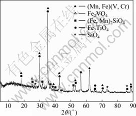 实验用转炉钒渣取自四川攀枝花地区,其主要化学成分见表11。钒渣的XRD谱如图4所示。实验用浸出剂由98%的化学纯浓硫酸稀释至一定浓度范围,气体为工业瓶装纯氧。
