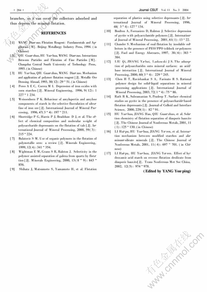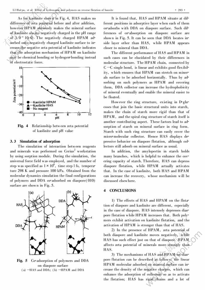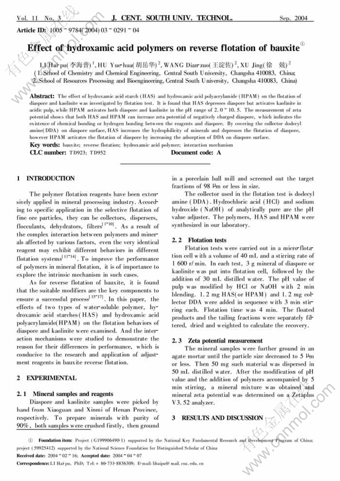 Key words:bauxite; reverse flotation; hydroxamic acid polymer; interaction mechanism