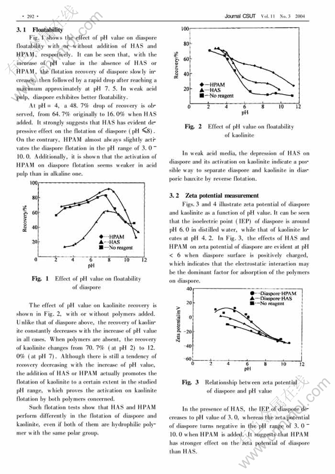 Abstract: The effect of hydroxamic acid starch (HAS) and hydroxamic acid polyacrylamide (HPAM) on the flotation of diaspore and kaolinite was investigated by flotation test. It is found that HAS depresses diaspore but activates kaolinite in acidic pulp,while HPAM activates both diaspore and kaolinite in the pH range of 2.0 10.5. The measurement of zeta potential shows that both HAS and HPAM can increase zeta potential of negatively charged diaspore, which indicates the existence of chemical bonding or hydrogen bonding between the reagents and diaspore. By covering the collector dodecyl amine(DDA) on diaspore surface,HAS increases the hydrophilicity of minerals and depresses the flotation of diaspore,however HPAM activates the flotation of diaspore by increasing the adsorption of DDA on diaspore surface.
