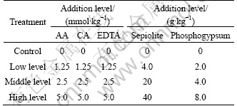 Sepiolite and phosphogypsum were added to each pot with concentrations of 0, 4.0, 20 and 40 g per kg soil, and 0, 2.0, 4.0 and 8.0 g per kg soil, respectively, then mixed thoroughly with heavy metal contaminated soils (Table 3). The pot soil maintained 70% of the total water-holding field capacity for 15 days equilibration. Then, three uniform size root systems of giant reed were transplanted into each pot and cultivated in a greenhouse with a daily 14 h photoperiod and 10 h dark period, with day/night temperature of 30 ℃/20 ℃, and relative humidity of 60%. Two weeks before harvesting, AA, CA and EDTA at the concentrations of 0, 1.25, 2.5 and 5.0 mmol/kg soil were added to the remaining pots, respectively (Table 3). Each treatment was four replicates.
