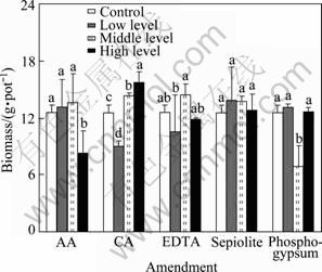 1) Soil amendments including AA, CA, EDTA, sepiolite and phosphogypsum can enhance the biomass to some extent. The shoot dry biomass of giant reed for treatments with 5.0 mmol/kg CA and 2.5 mmol/kg EDTA was 1.25 and 1.15 times that of the control, respectively.