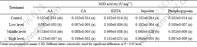 As shown in Table 5, SOD activity in leaves of giant reed was slightly increased with the increasing addition level of AA. The SOD activity obtained at high level treatment (0.123 U/mg) was slightly higher than that of the control, but significantly higher than that at low level treatment (P<0.05). SOD activity observed for treatment of CA varied slightly in comparison with that of the control. SOD activity changed slightly at low level treatment of sepiolite addition, while significant inhibition of 41.2% and 38.2% in SOD activity were found at middle level and high level treatments as compared to the control (P<0.05), respectively. Similar to CA addition treatment, SOD activity of giant reed for the treatment of phosphogypsum was slightly changed with respect to the control.