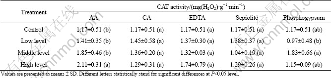 The activity of CAT in giant reed leaves was less sensitive to soil amendments but still stimulated as compared to the control (Table 6). CAT activity was prompted with AA addition, especially at high level treatment, which was up to 2.11 mg(H2O2)/(g·min) and significantly increased by 80.3% in comparison with the control (P<0.05). A slight increase in CAT activity in leaves was detected with increasing CA addition, but no significant difference in CAT activity at treatments between CA addition and the control was found. CAT activities were slightly affected by EDTA and sepiolite amendments, and that in leaves treated by middle level of phosphogypsum was higher than those from other level of phosphogypsum treatments and the control.
