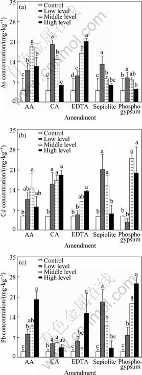 Fig. 2 Concentrations of As (a), Cd (b) and Pb (c) in giant reed grown on soils treated with different amendments