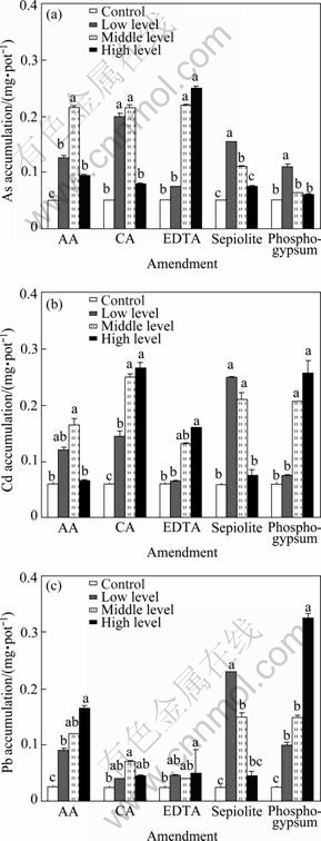 Fig. 3 Accumulations of As (a), Cd (b) and Pb (c) in giant reed grown on soils contaminated with heavy metals treated with different amendments