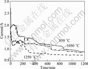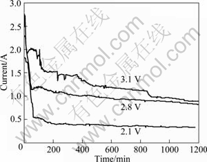 Fig.1 Current—time plots of electrolysis of pellets (sintering at 850 ℃ in air for 5 h) at different cell voltages for 20 h in CaCl2 molten salt at 850 ℃
