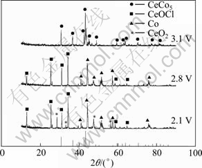 The electrolysis products were analyzed by XRD and the spectra are shown in Fig. 2. When 2.1 V was applied, the XRD pattern of the product exhibits the CeOCl, Co and CeO2 phases, but no CeCo5 phase is formed. At 2.8 V, in the XRD pattern of the product only CeOCl and Co peaks appear. It can be concluded that the mixed oxides only can be reduced to Co and CeOCl at 2.8 V, and the formation of CeCo5 needs a higher cell voltage, which is due to the individual difficulty of the electro-deoxidization of CeO2 (see Table 1). The XRD pattern of the product after electrolysis at 3.1 V shows that pure CeCo5 phase is formed.