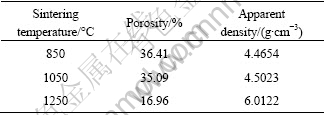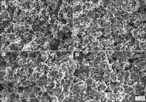 It has been claimed that the sintering temperature of the pellets plays an important role in the electro-deoxidization process [20]. In order to study the influence of sintering temperature, the oxide pellets were sintered at 850, 1050 and 1250 ℃ for 5 h in air. The porosity and density of the pellets after being sintered at three different temperatures are shown in Table 2. The data demonstrate that varying the sintering temperatures from 850 to 1050 ℃ influences very little on the apparent densities and porosities of the pellets. When the pellets were sintered at 1250 ℃, the decrease of the porosity and increase of the density are remarkable, which may lead to decrease of electrolysis rate. Figure 3 shows the microstructures of the cross section of the pellets sintered at 850, 1050 and 1250 ℃, prior to electrolysis. It can be seen that the microstructures of the pellets sintered at 850 ℃ and 1050 ℃ are similar to the pellet before sintering. But sintering of the pellets involves both the growth of strength and the shrinkage of the pellets, which can avoid powdering of the pellets in the molten. When the pellets were sintered at 1250 ℃, a mass of particles were clearly seen and their particle size was in the range of 1-10 μm.