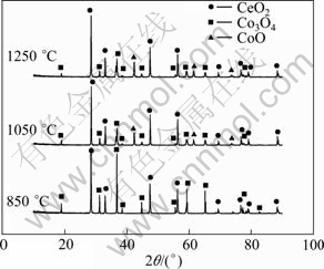 Figure 4 shows the XRD patterns of mixed oxides sintered at 850, 1050 and 1250 ℃ in air for 5 h. The pellets sintered at 850 ℃ still consist of the original oxides of CeO2 and Co3O4 and no new oxides appear, which means that the pellets are stable at below 850 ℃. After being sintered at 1050 ℃ and 1250 ℃, CoO appears, which is caused by the decomposition of Co3O4 [21].