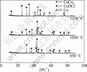 Figure 6 displays the XRD patterns of the samples sintered at 850, 1050, 1250 ℃ and then electrolyzed at 3.1 V for 20 h. As seen in Fig. 6, the sample sintered at 850 ℃ is completely electrolyzed and pure CeCo5 phase is formed. As to the pellets sintered at 1050 ℃, XRD spectrum shows that the product mainly consists of CeCo5, but a little CeOCl and Co phases exist. The sample sintered at 1250 ℃ after electrolysis shows that some CeCo5 is formed, but CeOCl and Co phases are dominant. Clearly, the results further demonstrate that increasing the sintering temperature does lead to a lower reduction rate.