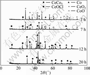 In order to investigate the effect of electrolysis time on the electro-deoxidation process, the electrolysis was carried out at 3.1 V for different time and then the obtained products were analyzed by XRD. Figure 7 shows the XRD patterns of the products that were electrolyzed at 3.1 V for 1, 7, 12 and 20 h. After being electrolyzed for 1 h, the XRD pattern of the product exhibits CoO, CeO2, CeOCl and Co phases, but formation of CeCo5 phase does not take place, which may suggest that reactions (1), (2) and (3) occur, that is, the Co3O4 reduces to CoO and Co, and the CeO2 reduces to CeOCl.